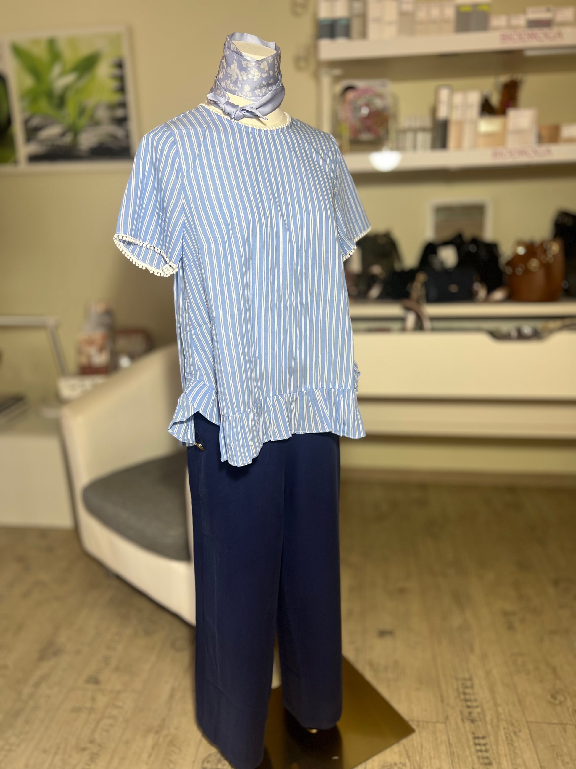 Süße und trendige Baumwollbluse mit gestreiftem Muster, kurzen Ärmeln und Spitzenband am Ausschnitt und den Ärmeln. Die geknöpfte Rückseite und die Rüschen am Saum machen die Bluse zu einem Hingucker. Aus 100% Baumwolle. Perfekt für jeden Anlass im Frühling und im Sommer! ✨